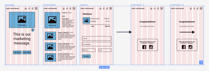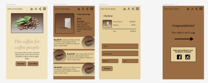 For color palettes, I used the Coolers tool, and started with a few colors associated with some other coffee brands based on a bit of online searching, and came up with a few base colors, shade colors and highlight colors. Most colors weren’t used in the Hi-Fi, but the palette selection was intended to be available for future iterations.