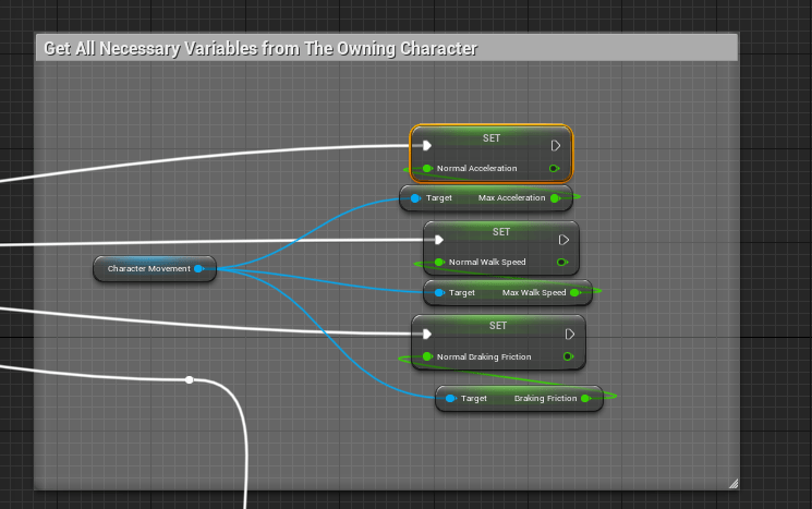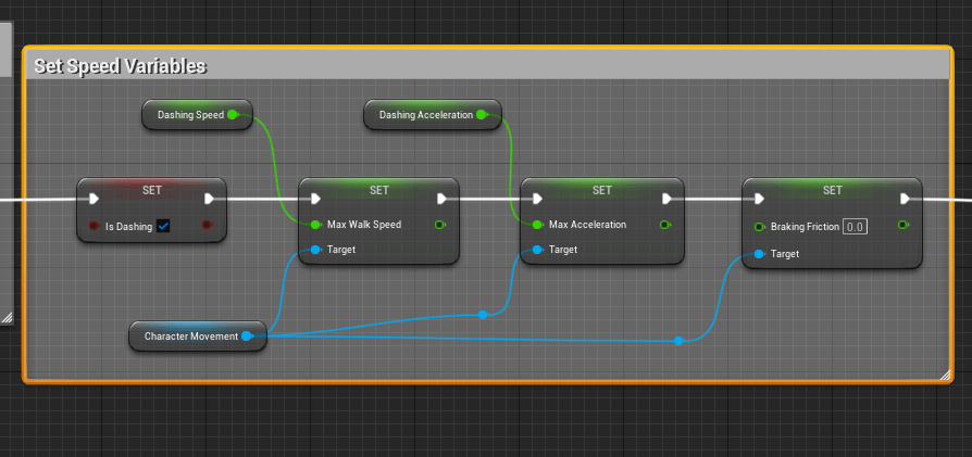 First, the inherited character movement component (from Owner) will get the base Acceleration, Walk Speed and Braking Friction variables (floats) and set them to variables inside of the AC_DashAbility Component.