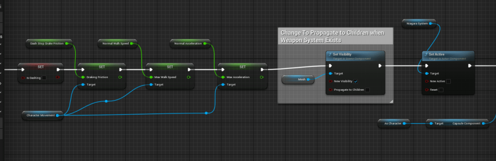 After these checks, if the dash is successful, it will turn on the Niagara System component (set new active to TRUE), set an “isDashing” boolean to TRUE and set the players Speed, Acceleration and Breaking Friction to the speed required to perform the dash.