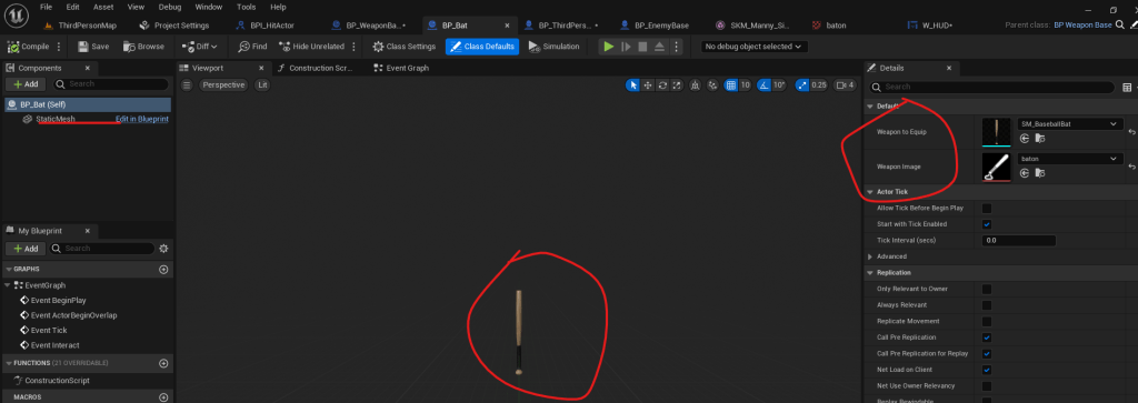 From there, I created a child actor, which I will call BP_Bat. Assigning values to the WeaponToEquip variable as well as the WeaponImage variable. The WeaponImage variable is just a generic icon I got from GameIcons.Net, which will be used in the UI to show that the player is holding a weapon.