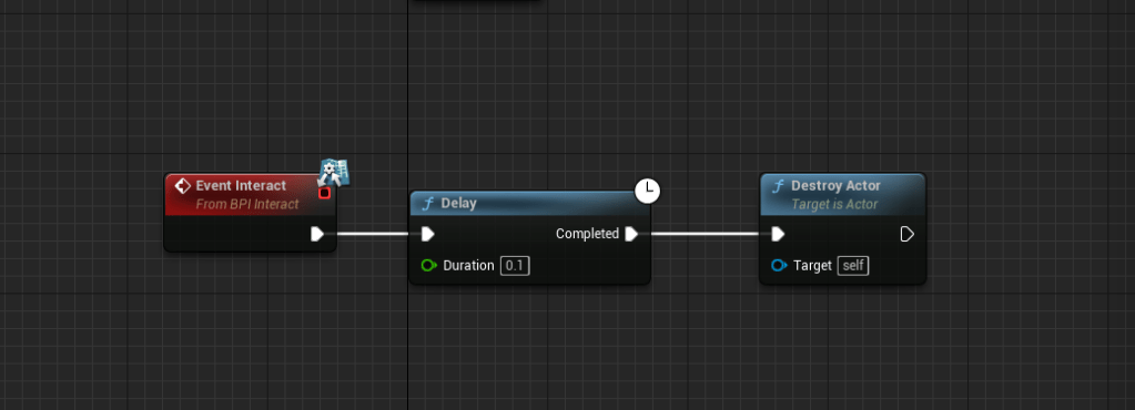 The last step (but it’s an important one) is to add a delay between calling the interact event and the destroying of the actor that happens when the player interacts with the item. This is because if not, Unreal Engine will throw an error and not allow the item to be equipped. The delay is just .1 seconds long.