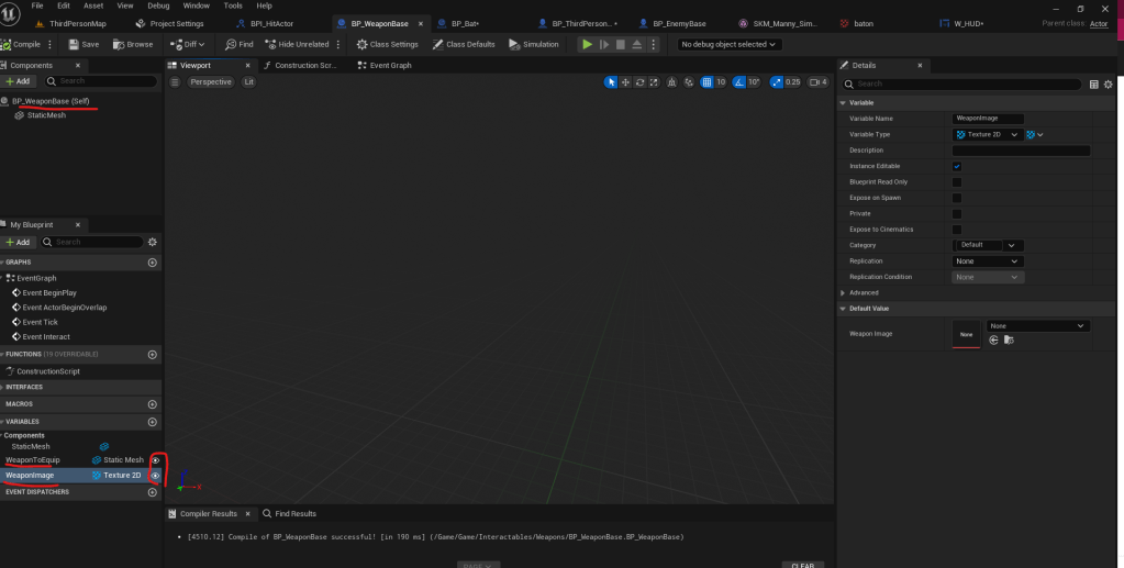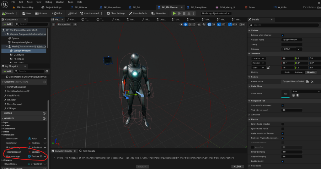 I also added two more variables to the player character. A boolean called HoldingWeapon and a Texture2D called WeaponImage.