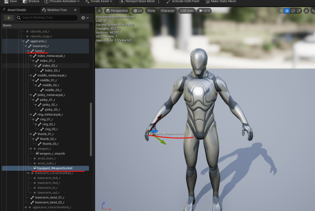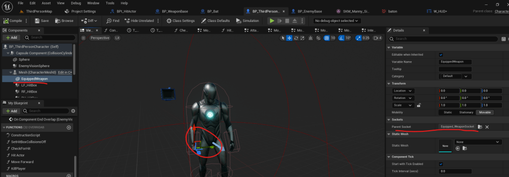 First, I added a new Static Mesh component to the player character (as a child of the CharacterMesh) and called it EquippedWeapon. This mesh will be parented to a new socket on the SkeletalMesh that I called Equipped_WeaponSocket. I personally parented this new socket to the right hand since I want the player to equip items in their right hand.