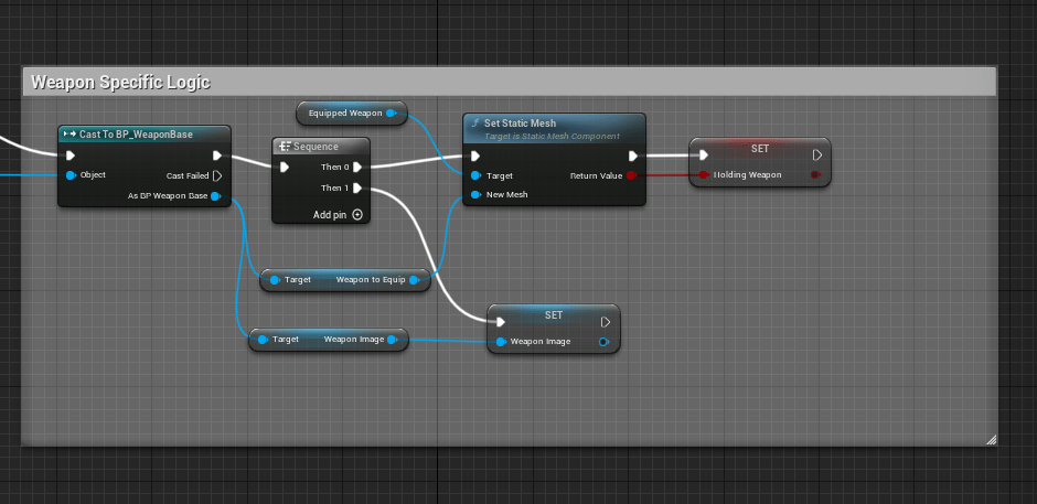 From here, the next step is to add logic to the interaction function that will allow the player to pick up there weapon. This is fairly simple, I just take the interactable and cast to the BP_WeaponBase, and in sequence I grab the WeapnoToEquip mesh, set it to the EquippedWeapon mesh on the player, and do the same for the WeaponImage from the BP_WeaponBase actor (just assigning it to the WeaponImage variable on the player character). I also set the HoldingWeapon Boolean to True.
